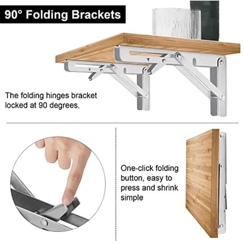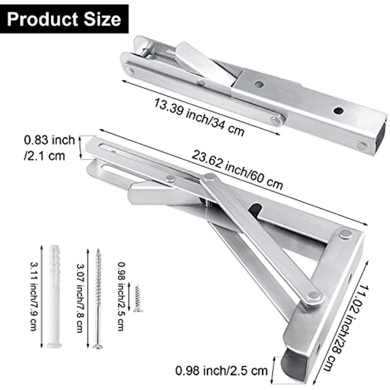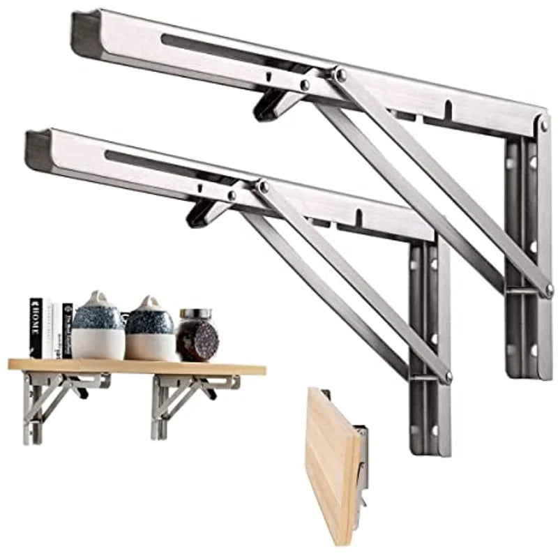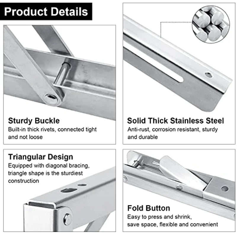 Această consolă pliabilă din oțel inoxidabil este ideală pentru susținerea rafturilor și meselor pliabile. Designul său montat pe perete economisește spațiu, oferind stabilitate și durabilitate pentru utilizări multiple în bucătărie, dormitor sau spații de lucru.