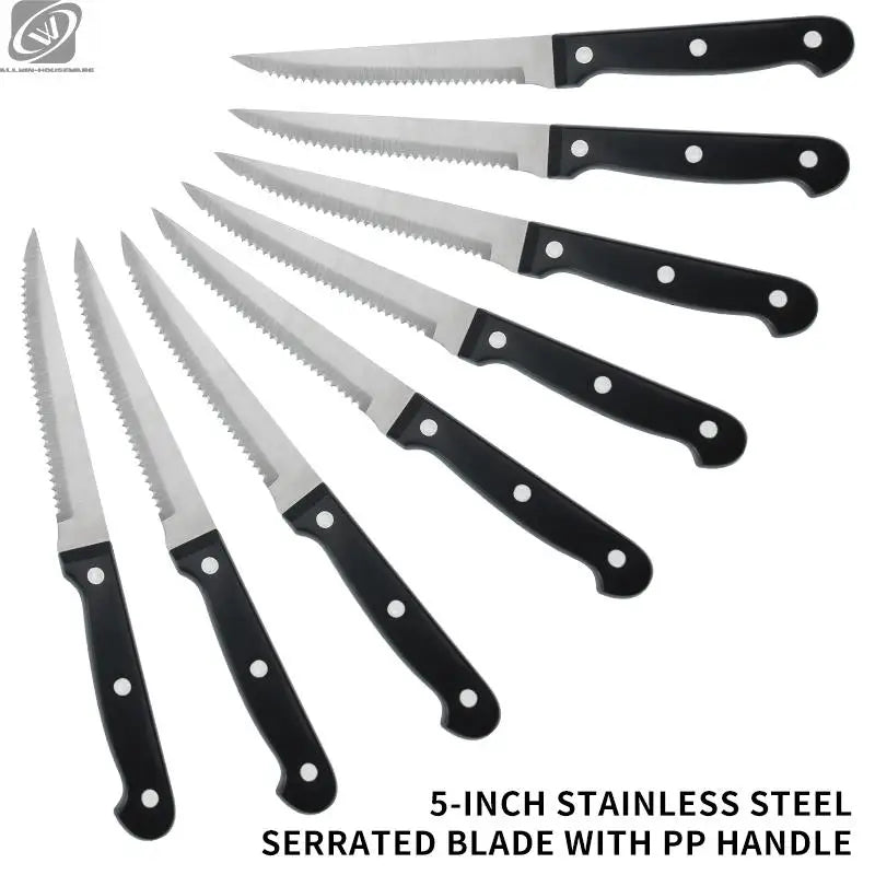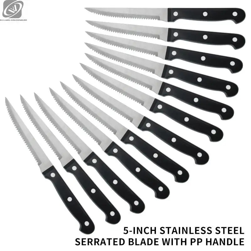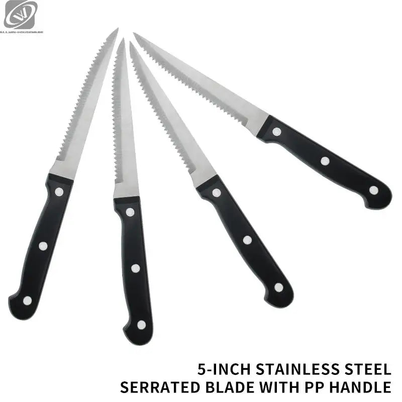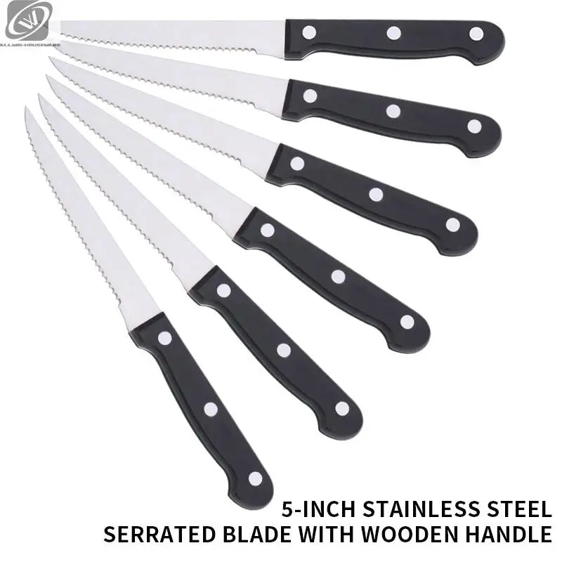 Setul de cuțite pentru friptură este ideal pentru utilizare în bucătărie sau în aer liber, la picnicuri și grătare. Cu o lamă din oțel inoxidabil, ascuțită și durabilă, cuțitele sunt proiectate pentru a tăia cu ușurință carne, pește sau alte alimente. Designul cu lamă zimțată oferă o tăiere precisă și fără lipire, iar mânerul ergonomic din PP negru asigură confort și control în utilizare. Perfecte pentru diverse sarcini culinare, aceste cuțite aduc funcționalitate și eleganță în orice bucătărie.