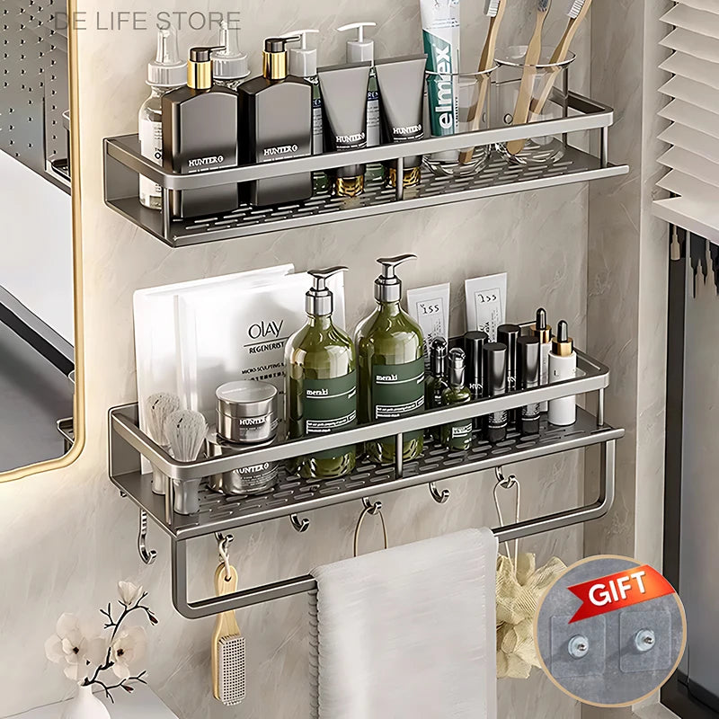 Raft de baie fără perforare, fabricat din aluminiu rezistent, disponibil în dimensiuni de 30 cm, 40 cm și 50 cm. Ideal pentru organizarea șamponului, gelurilor de duș și altor accesorii de baie, acest organizator modern economisește spațiu și oferă un decor elegant.