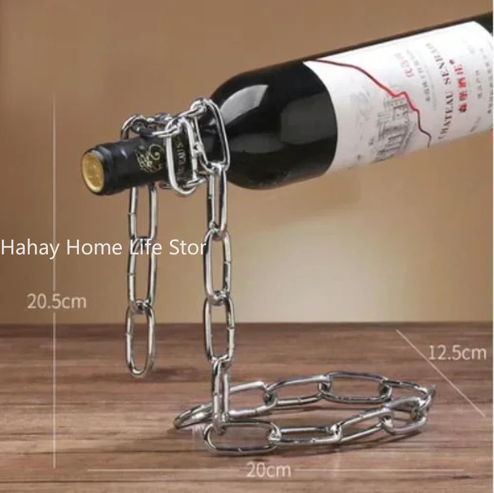 Acest suport unic pentru sticle de vin, confecționat din lanț metalic de fier, oferă un efect magic de suspensie, creând iluzia unei sticle plutitoare. Este perfect pentru a adăuga o notă de eleganță și stil în bucătărie, sufragerie, cramă sau bar. Designul său robust și stabil oferă o soluție decorativă și funcțională pentru expunerea unei sticle de vin preferate, fiind ideal pentru pasionații de vin sau pentru a impresiona oaspeții.