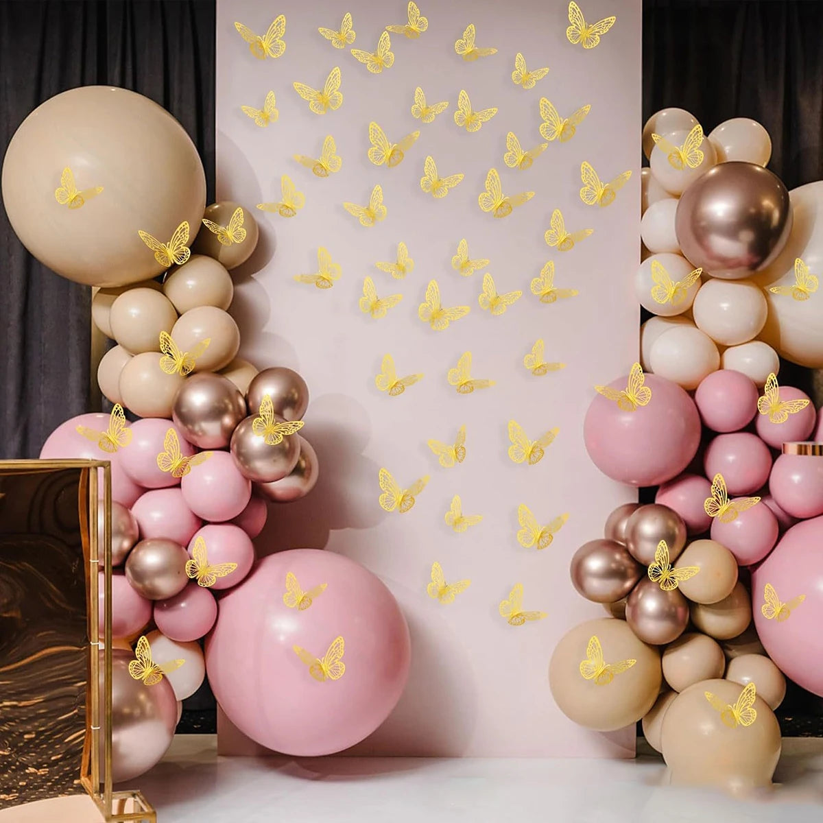 Set de 48 fluturi 3D aurii, în 4 modele și 3 dimensiuni diferite, ideal pentru decorarea pereților, torturilor, camerelor sau petrecerilor tematice. Fluturii adaugă un strop de eleganță și farmec oricărui spațiu sau eveniment.